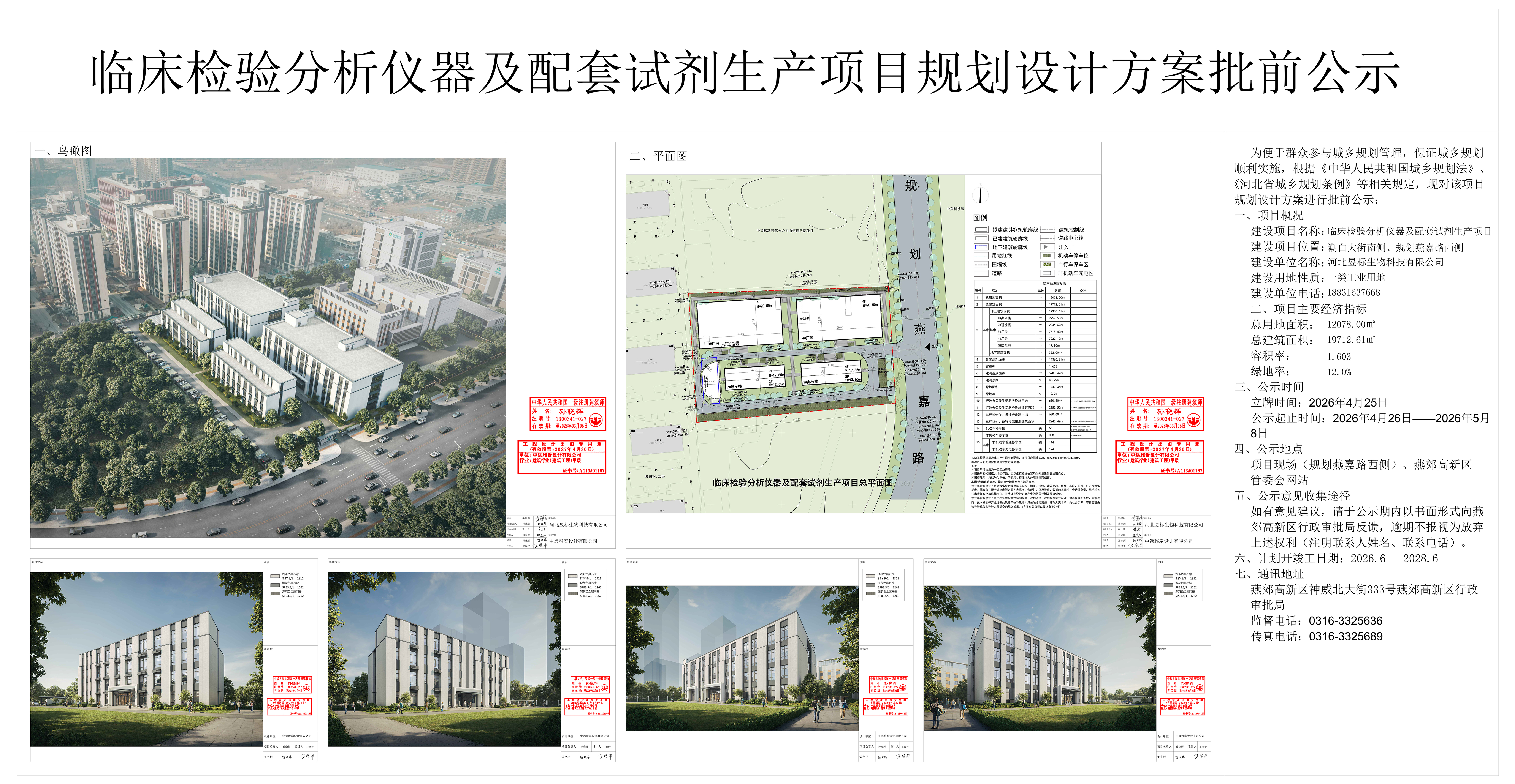 临床检验分析仪器及配套试剂生产项目规划设计方案批前公示于2026年4月26日一2026年5月8日在项目现场(规划燕嘉路西侧),燕郊高新区管委会网站公示,如有意见建议,请于公示期内以书面形式向燕郊高新区行政审批局反馈,逾期不报视为放弃上述权利(注明联系人姓名、联系电话)。(方案有关指标以最终审批为准)。
