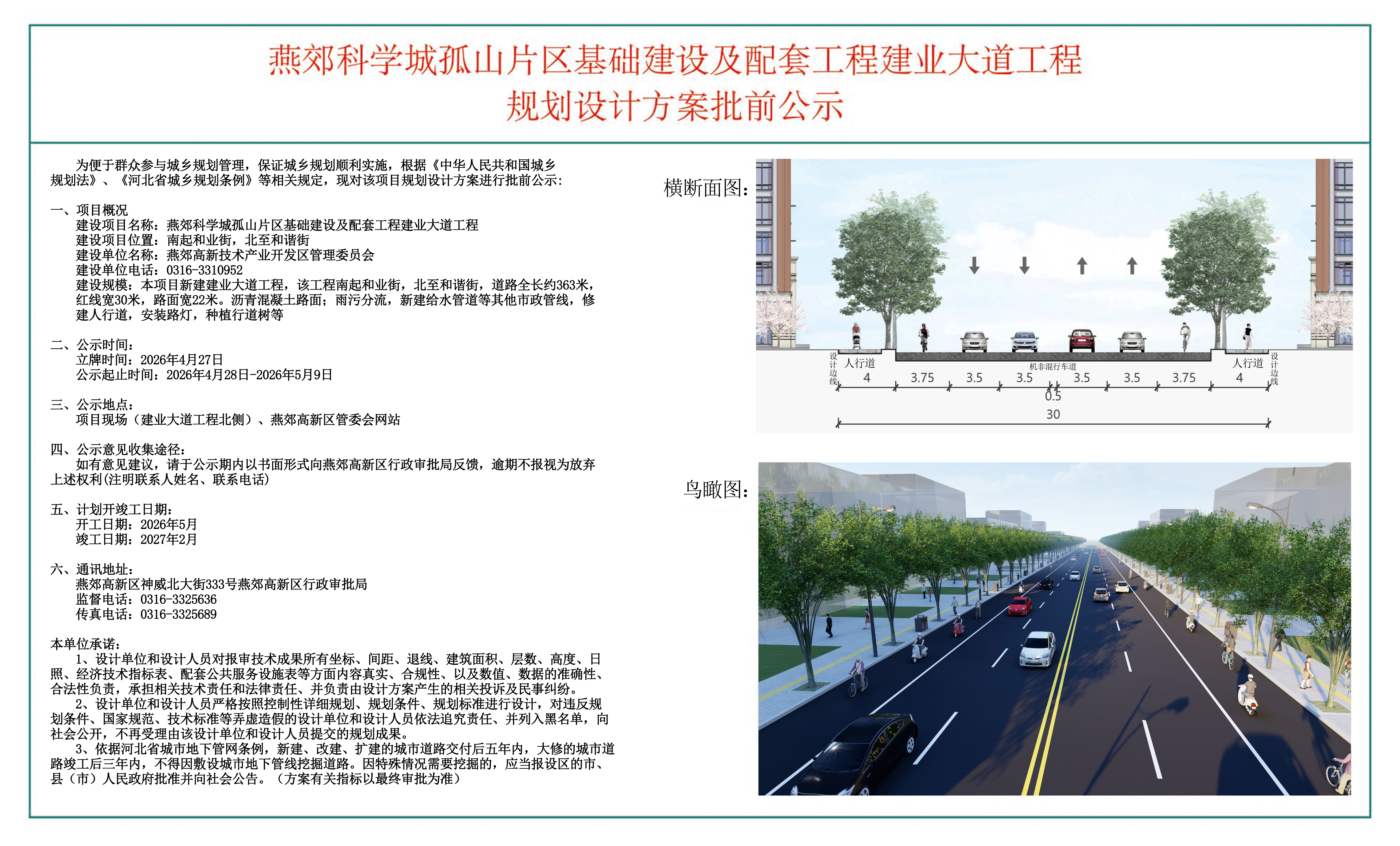 燕郊科学城孤山片区基础建设及配套工程建业大道工程规划设计方案批前公示于2026年4月28日一2026年5月9日在项目现场(建业大道工程北侧),燕郊高新区管委会网站公示,如有意见建议,请于公示期内以书面形式向燕郊高新区行政审批局反馈,逾期不报视为放弃上述权利(注明联系人姓名、联系电话)。(方案有关指标以最终审批为准)。